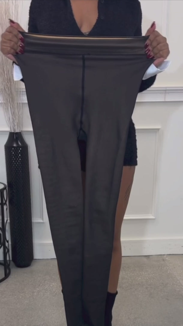Fleece lined black tights. 92%polyester, 8% spandex. Super stretchy— model seen wearing size s/m.